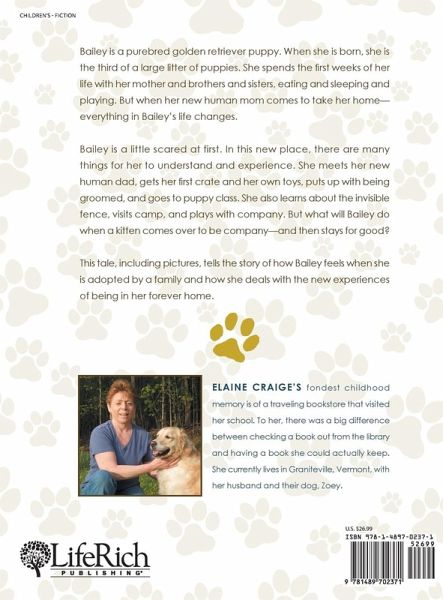 Bailey is a purebred golden retriever puppy. When she is born, she is the third of a large litter of puppies. She spends the first weeks of her life with her mother and brothers and sisters, eating and sleeping and playing. But when her new human mom comes to take her home-everything in Bailey's life changes. Bailey is a little scared at first. In this new place, there are many things for her to understand and experience. She meets her new human dad, gets her first crate and her own toys, puts up with being groomed, and goes to puppy class. She also learns about the invisible fence, visits camp, and plays with company. But what will Bailey do when a kitten comes over to be company-and then stays for good? This tale, including pictures, tells the story of how Bailey feels when she is adopted by a family and how she deals with the new experiences of being in her forever home.