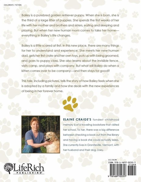Bailey is a purebred golden retriever puppy. When she is born, she is the third of a large litter of puppies. She spends the first weeks of her life with her mother and brothers and sisters, eating and sleeping and playing. But when her new human mom comes to take her home-everything in Bailey's life changes. Bailey is a little scared at first. In this new place, there are many things for her to understand and experience. She meets her new human dad, gets her first crate and her own toys, puts up with being groomed, and goes to puppy class. She also learns about the invisible fence, visits camp, and plays with company. But what will Bailey do when a kitten comes over to be company-and then stays for good? This tale, including pictures, tells the story of how Bailey feels when she is adopted by a family and how she deals with the new experiences of being in her forever home.
