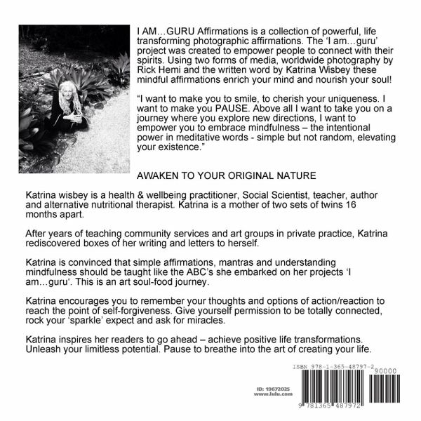 I Am Guru Affirmations is a project empowering you to connect with your spirit. You have chosen to search for your true meaning, to awaken your original nature. In the jungle of our modern society you are searching for the quiet space, your inner sanctum, your peace away from all this noise. The power of affirmations cannot be denied. You are what you repeat. Affirmations can be hypnotic. The affirmations in I Am Guru Affirmations are specially structured to send powerful messages to your inner kore to direct your path to where YOU want to go not to a place where others expect you to be. I Am Guru Affirmations cut through the bullshit of the external world. Photography by Rick Hemi and hypnotic words by Katrina enrich your mind and nourish your soul. They lift your spirit empowering you to move forward too climb your personal mountains. Photos with words enter your right and left brains in unison diving deep to your inner kore lifting and enlightening you. Beauty to share with friends.