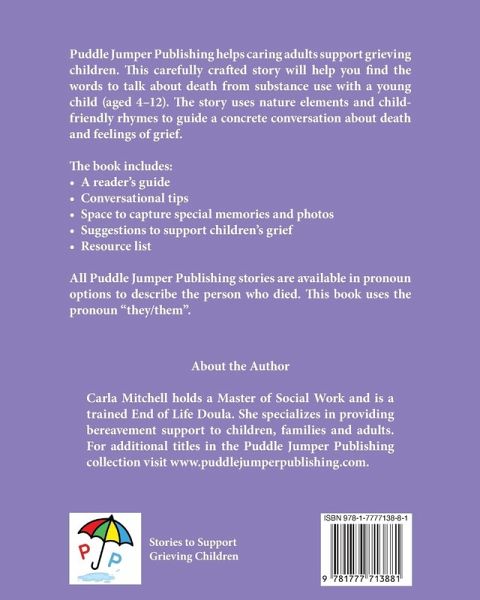 Puddle Jumper Publishing helps caring adults support grieving children. This is carefully crafted story will help you find the words to talk about death from substance use with a young child (aged 4-12). The story uses nature elements and child- friendly rhymes to guide a concrete conversation about death and feelings of grief. Puddle Jumper Publishing stories help address the five most common concerns of grieving children, "Did I cause it?", "Can I catch it?", "Can I cure it?, "Who will care for me?" and "How will I stay connected?". All Puddle Jumper Publishing stories are available in pronoun options to describe the person who died. This book uses the pronoun "they".