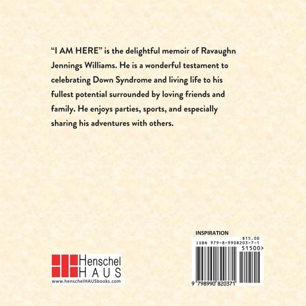 "I AM HERE" is the delightful memoir of Ravaughn Jennings Williams. He is a wonderful testament to celebrating Down Syndrome and living life to his fullest potential surrounded by loving friends and family. He enjoys parties, sports, and especially sharing his adventures with others.