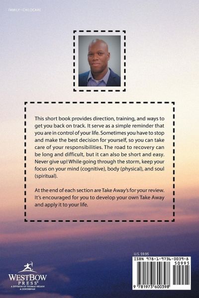This short book provides direction, training, and ways to get you back on track. It serve as a simple reminder that you are in control of your life. Sometimes you have to stop and make the best decision for yourself, so you can take care of your responsibilities. The road to recovery can be long and difficult, but it can also be short and easy. Never give up! While going through the storm, keep your focus on your mind (cognitive), body (physical), and soul (spiritual). At the end of each section are Take Away's for your review. It's encouraged for you to develop your own Take Away and apply it to your life.