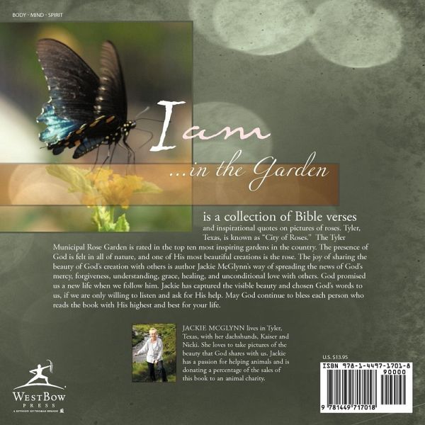 "I AM" ... in the Garden is a collection of Bible verses and inspirational quotes on pictures of roses. Tyler, Texas, is known as "City of Roses." The Tyler Municipal Rose Garden is rated in the top ten most inspiring gardens in the country. The presence of God is felt in all of nature, and one of His most beautiful creations is the rose. The joy of sharing the beauty of God's creation with others is author Jackie McGlynn's way of spreading the news of God's mercy, forgiveness, understanding, grace, healing, and unconditional love with others. God promised us a new life when we follow him. Jackie has captured the visible beauty and chosen God's words to us, if we are only willing to listen and ask for His help. May God continue to bless each person who reads the book with His highest and best for your life.