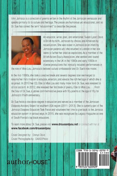 I Am Jamaica is a collection of poems written in the rhythm of the Jamaican vernacular and speaks primarily to its culture and heritage. The pieces are humorous yet educational, and so Dr. Sue has coined the term "edutainment" to describe the pieces.