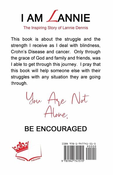 This book is about the struggles and the strength I had while dealing with blindness, Crohn's disease and cancer. Only through the grace of God, family and friends was I able to get through this journey. I pray that this book will help someone else with their struggles with any difficult situation they may be facing. YOU ARE NOT ALONE.