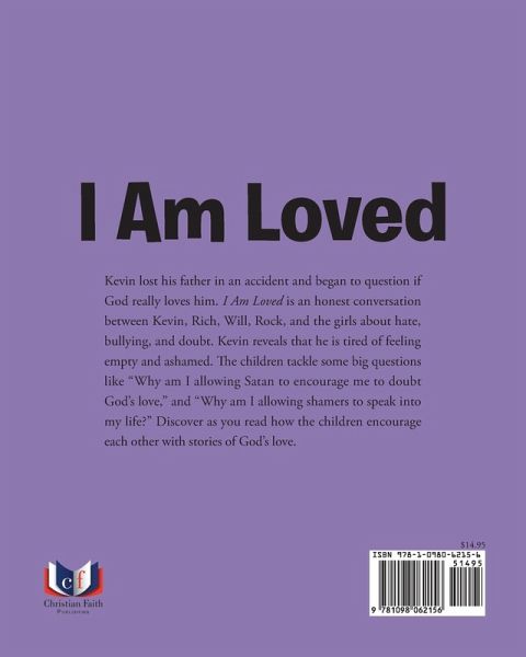 Kevin lost his father in an accident and began to question if God really loves him. I Am Loved is an honest conversation between Kevin, Rich, Will, Rock, and the girls about hate, bullying, and doubt. Kevin reveals that he is tired of feeling empty and ashamed. The children tackle some big questions like Why am I allowing Satan to encourage me to doubt Gods love, and Why am I allowing shamers to speak into my life? Discover as you read how the children encourage each other with stories of Gods love.