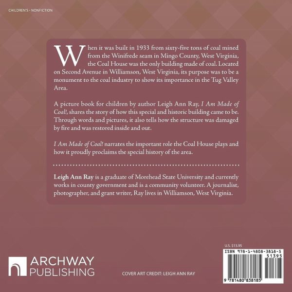When it was built in 1933 from sixty-five tons of coal mined from the Winifrede seam in Mingo County, West Virginia, the Coal House was the only building made of coal. Located on Second Avenue in Williamson, West Virginia, its purpose was to be a monument to the coal industry to show its importance in the Tug Valley Area. A picture book for children by author Leigh Ann Ray, I Am Made of Coal!, shares the story of how this special and historic building came to be. Through words and pictures, it also tells how the structure was damaged by fire and was restored inside and out. I Am Made of Coal! narrates the important role the Coal House plays and how it proudly proclaims the special history of the area.