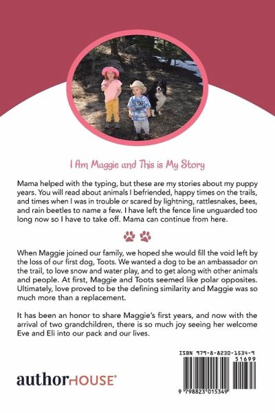 Mama helped with the typing, but these are my stories about my puppy years. You will read about animals I befriended, happy times on the trails, and times when I was in trouble or scared by lightning, rattlesnakes, bees, and rain beetles to name a few. I have left the fence line unguarded too long now so I have to take off. Mama can continue from here. When Maggie joined our family, we hoped she would fill the void left by the loss of our first dog, Toots. We wanted a dog to be an ambassador on the trail, to love snow and water play, and to get along with other animals and people. At first,…mehr