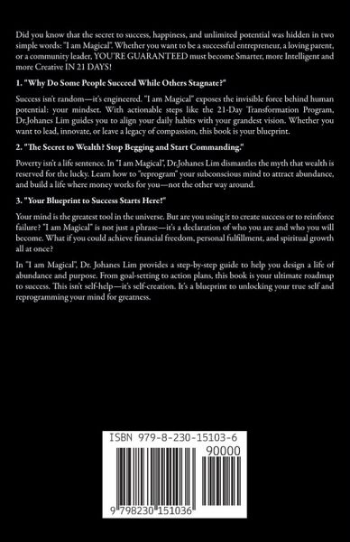 Did you know that the secret to success, happiness, and unlimited potential was hidden in two simple words: "I am Magical". Whether you want to be a successful entrepreneur, a loving parent, or a community leader, YOU'RE GUARANTEED must become Smarter, more Intelligent and more Creative IN 21 DAYS! 1. "Why Do Some People Succeed While Others Stagnate?" Success isn't random-it's engineered. "I am Magical" exposes the invisible force behind human potential: your mindset. With actionable steps like the 21-Day Transformation Program, Dr.Johanes Lim guides you to align your daily habits with your grandest vision. Whether you want to lead, innovate, or leave a legacy of compassion, this book is your blueprint. 2. "The Secret to Wealth? Stop Begging and Start Commanding." Poverty isn't a life sentence. In "I am Magical", Dr.Johanes Lim dismantles the myth that wealth is reserved for the lucky. Learn how to "reprogram" your subconscious mind to attract abundance, and build a life where money works for you-not the other way around. 3. "Your Blueprint to Success Starts Here!" Your mind is the greatest tool in the universe. But are you using it to create success or to reinforce failure? "I am Magical" is not just a phrase-it's a declaration of who you are and who you will become. What if you could achieve financial freedom, personal fulfillment, and spiritual growth all at once? In "I am Magical", Dr. Johanes Lim provides a step-by-step guide to help you design a life of abundance and purpose. From goal-setting to action plans, this book is your ultimate roadmap to success. This isn't self-help-it's self-creation. It's a blueprint to unlocking your true self and reprogramming your mind for greatness.