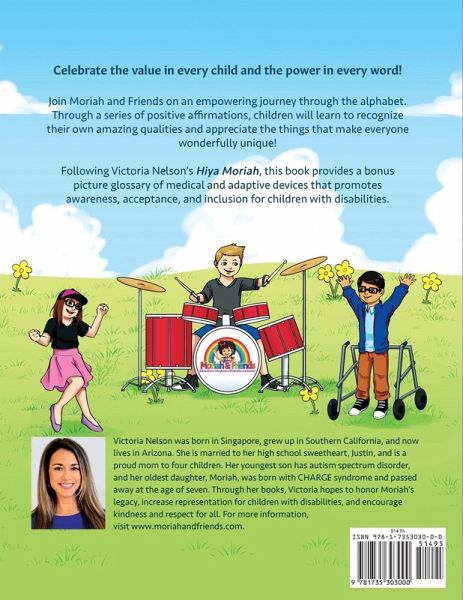 Victoria Nelson was born in Singapore, grew up in Southern California, and now lives in Arizona. She is married to her high school sweetheart, Justin, and is a proud mom to four children. Her youngest son has autism spectrum disorder, and her oldest daughter, Moriah, was born with CHARGE syndrome and passed away at the age of seven. Through her books, Victoria hopes to honor Moriah's legacy, increase representation for children with disabilities, and encourage kindness and respect for all. For more information, visit www.moriahandfriends.com.