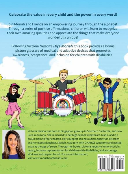 Celebrate the value in every child and the power in every word!Join Moriah and Friends on an empowering journey through the alphabet. Through a series of positive affirmations, children will learn to recognize their own amazing qualities and appreciate the things that make everyone wonderfully unique! Following Victoria Nelson's Hiya Moriah, this book provides a bonus picture glossary of medical and adaptive devices that promotes awareness, acceptance, and inclusion for children with disabilities.