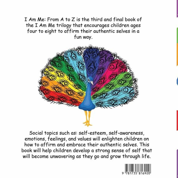 I Am Me: From A to Z is the third and final book of the I Am Me trilogy that encourages children ages four to eight to affirm their authentic selves in a fun way. Social topics such as: self-esteem, self-awareness, emotions, feelings, and values will enlighten children on how to affirm and embrace their authentic selves. This book will help children develop a strong sense of self that will become unwavering as they go and grow through life.