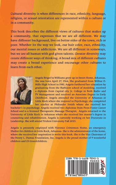 Cultural diversity is when differences in race, ethnicity, language, religion, or sexual orientation are represented within a culture or in a community. This book describes the different views of cultures that makes up a community, that expresses that we are all different. We may have different background, live on better sides of the town, rich or poor. Weather its the way we look, our hair color, race, ethnicity, our mental issues or addictions. We are all different in someways, but we are all human with god given talents. Greater diversity may create different ways of thinking. A broad mix of different cultures may create a broad experience and encourage other cultures to learn from each other. Angela Briget'ta Williams grew up in Sweet Home, Arkansas. She was born April 27, 1964. She graduated from Wilbur D. Mills High School in 1981. Angela furthered her education by graduating from the Barbizon school of modeling, received a diploma from Capital city Jr. College in Both Radio and TV Management and received an Associate Degree in Early Childhood. Angela attended the University of Arkansas at Little Rock where she majored in Psychology; she completed her studies at Philander Smith where she received her bachelor's in psychology. Angela received two diplomas from Penn Foster Career School and is a licensed Therapeutic Massage Therapist. Angela returned to the University of Little Rock in Arkansas where she received her master's degree in counseling and rehabilitation. Angela is currently working on her Doctorate in Leadership. She will attend Trident University Fall 2023. Angela is presently employed with Florence Crittenton Home, an emergency Shelter for children in Little Rock, Arkansas. She is the administrator of the home, where she got her inspiration to write this book. She is the Vice Chairman of the Henry L. Dumas Foundation, Inc. Angela is the proud mother of 9 wonderful children and 23 Grandchildren.