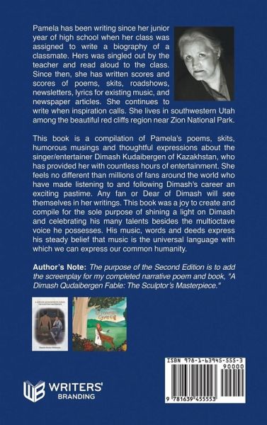 Pamela has been writing since her junior year of high school when her class was assigned to write a biography of a classmate. Hers was singled out by the teacher and read aloud to the class. Since then, she has written scores and scores of poems, skits, roadshows, newsletters, lyrics for existing music, and newspaper articles. She continues to write when inspiration calls. She lives in southwestern Utah among the beautiful red cliffs region near Zion National Park. This book is a compilation of Pamela's poems, skits, humorous musings and thoughtful expressions about the singer/entertainer Dimash Kudaibergen of Kazakhstan, who has provided her with countless hours of entertainment. She feels no different than millions of fans around the world who have made listening to and following Dimash's career an exciting pastime. Any fan or Dear of Dimash will see themselves in her writings. This book was a joy to create and compile for the sole purpose of shining a light on Dimash and celebrating his many talents besides the multioctave voice he possesses. His music, words and deeds express his steady belief that music is the universal language with which we can express our common humanity. Author's Note: The purpose of the Second Edition is to add the screenplay for my completed narrative poem and book, "A Dimash Qudaibergen Fable: The Sculptor's Masterpiece."