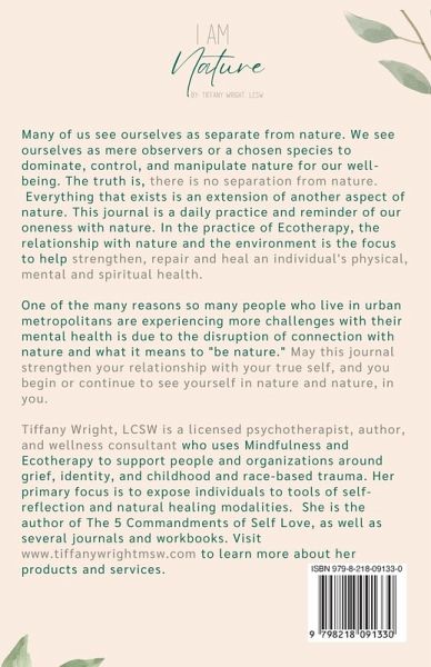 This journal is a daily practice and reminder of our oneness with nature. In the practice of Ecotherapy, the relationship with nature and the environment is the focus to help strengthen, repair, and heal an individual's physical, mental and spiritual health. This journal was created by a licensed psychotherapist who practices and believes in the power of Ecotherapy. One of the many reasons so many people who live in urban metropolitans are experiencing more challenges with their mental health is due to the disruption of connection with nature and what it means to "be nature." The journal is filled with prompts that allow you to explore your relationship with various aspects of nature. There are also blank pages that allow you to write or draw reflections as well.