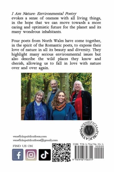 I Am Nature: Environmental Poetry evokes a sense of oneness with all living things, in the hope that we can move towards a more caring and optimistic future for the planet and its many wondrous inhabitants. Four poets from North Wales have come together, in the spirit of the Romantic poets, to express their love of nature in all its beauty and diversity. They highlight many serious environmental issues but also describe the wild places they know and cherish, allowing us to fall in love with nature over and over again. Contributors: Leaf Pettit, Diana Sanders, Andrew Sumner & Pat Sumner.