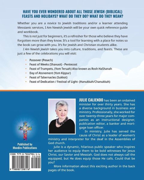 Julie Caliendo grew up on the south side of Chicago attending a Baptist church, but also participated with her family in the Catholic church for special occasions. Her father was one of six brothers, three were Baptist, and the other three were Catholic. It was a family thing to respect both places of worship. This gave her the ability to view her Christian faith from two perspectives leaving her open to broader horizons ahead. At eleven years old Julie gave her heart to Jesus and was baptized in the Baptist church. Julie is an ordained minister and has been serving the cause of Christ for over thirty years. In 2019, she was introduced to the pastors of Son of David Messianic Fellowship, a group which would be holding Saturday services at Chandler First Assemblies of God Church, which is where she worshipped. As an avid student of the Bible, she ventured in with open heart and mind to see what they were all about. Through their teaching, she saw the Bible with eyes of discovery. There was so much she didn't understand about the Torah, the feasts, and Old Testament commands of God. Sermon after sermon, she compiled copious notes as part of her methodical learning process. It was as if she was reading the Bible for the first time. Such excitement! Thus, her journey began, with a voracious appetite.Julie's professional life: She worked for eleven years as an instructional designer in the fraud department for a major credit card company in Phoenix. She wrote training manuals and materials for fraud investigators. She was also a contributing editor for an internal news publication, Express It, with a staff of reporters.As a retiree now, Julie serves the cause of Christ in full-time ministry. When her husband died in 2016, she attended a Bible-based, Christ-centered grief recovery program: "GriefShare." After participating in her first series of classes for herself, she started a grief recovery ministry at her church and has been a facilitator and ministry leader ever since helping others overcome their loss of loved ones. This lady keeps busy with various community organizations: Toastmasters International for over twenty-five years to hone her public speaking and leadership skills, Widow Warriors ministry to support other widows, Mesa Christian Writer's Group to raise the bar on her writing skills. Clear communication is important to Julie. She is not only a public speaker and author, she served in church as an interpreter for the deaf for many years. She graduated from the Phoenix College Interpreter for the Deaf Training Program and has been involved in Deaf Ministry since 1988. She published her first book: "A Christian Interpreter's Code of Ethics." Her goal was to raise a standard and equip church interpreters to serve God in the deaf community.Julie embraces her Christian faith through participation in two churches, just as she did as a growing child. Once again Julie is bridging a gap between two worlds: Baptist and Catholic, Deaf and hearing lives, Christian and Jewish/Biblical beliefs. On Saturdays, she is an active member and Elder of Son of David Messianic Fellowship, which inspired this book. On Sundays, she attends Chandler First Assembly, who hosts the GriefShare ministry. God uses her now to impact both Christian denominations. She is Newish Jewish on Saturdays and Pentecostal on Sundays. What a calling!