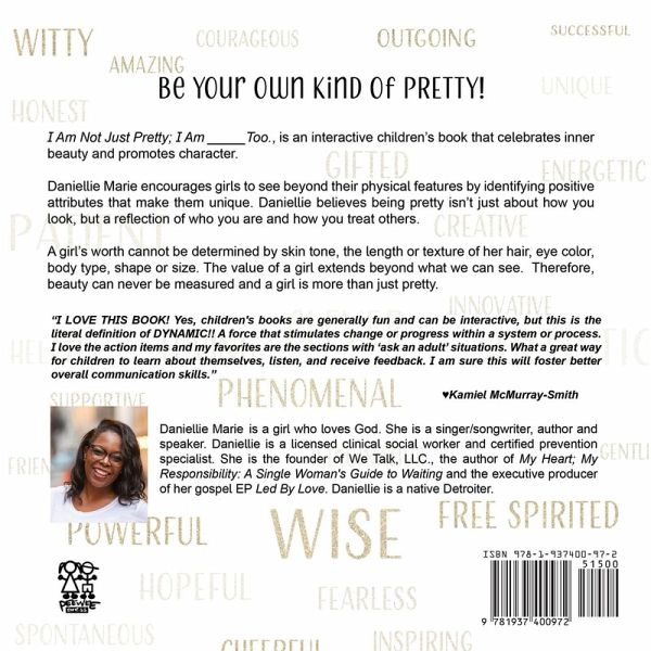 I am not just pretty; I am ____ too., is an interactive book to promote character and celebrate positive attributes of young girls. This learning tool highlights over 40 attributes and offers discussion questions, to facilitate and encourage, learning with an adult. Beauty cannot be measured and a girl is more than just pretty.