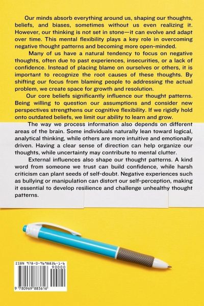 From the time we are born, many things shape the way we think. Our culture, family, schooling, parenting, marriage, and jobs all play a part in building our thoughts and how we see ourselves and the world. If we grow up in a family that values hard work or education, a push to work hard, it adds to the complexity of our thoughts. Same would apply to those who were raised in a dysfunctional home, where addictions, abuse, trauma and even being raised by a single parent affects our thinking. It's important to remember that thoughts themselves aren't good or bad, it's what we do with them that really matters. As children, our minds are like sponges soaking up everything around us. This shapes the views and biases that might stay with us our whole lives. But our thinking doesn't have to stay the same. Over time, we can change the way we think. This ability to change our thoughts can make a big difference. It can help us move past harmful thinking patterns and become more flexible in our thinking.We often focus more on negative thoughts than positive ones. This might come from feeling insecure, not confident, or from situations that point out our flaws. Instead of blaming ourselves or others, we should try to understand why we think this way. We need to learn how to separate ourselves and others from problems and target the problem and not the person. Our beliefs also play a big role in how we think. Being open to new ideas and ready to question our own beliefs can help us grow mentally. If we stick too firmly to old beliefs, we limit how much we can learn and grow.There are different parts of our brain are responsible for different kinds of thinking. Some of us might be more logical and analytical, while others are more creative and emotional. Whether or not we have a clear plan for our lives can either make our thoughts more chaotic or give us a sense of direction.Thoughts are also influenced by the world around us. Advice from someone we respect or a mean comment from someone else can change how we feel and think. Our perceptions can have a negative impact on our lives more than we can imagine. Being bullied or manipulated can mess with our ability to think clearly and make us doubt ourselves. This understanding helps us navigate through our thoughts more effectively, allowing us to change, refine, and even completely transform how we think. Knowing where our thoughts come from not only offers insight into our own minds but also empowers us to guide our thoughts in new, more positive directions.Unwanted, intrusive thoughts can interrupt our peace of mind. These thoughts usually come from past bad experiences, traumas, or deep fears. Learning how to handle these unwanted thoughts can really help improve our mental health and happiness.Just like an athlete works hard to be in top shape, we can train our minds to focus on success and well-being. This strong mindset includes being resilient, staying focused, changing our behaviours, choices and always trying to better ourselves. Finally, seeing ourselves as others see us can give us a complete picture of who we are and how we think. This means being honest with ourselves, recognizing our faults, and pursuing to become better than our best. By doing this, we can overcome obstacles, take on challenges, and move past regrets. This leads to a life that's more rewarding and meaningful. This book will help your understand you thoughts and how to get rid of unwanted intrusive thoughts that is affecting you day-today life. Your will be empowered to tap into the power of resiliency to become an achiever in life.
