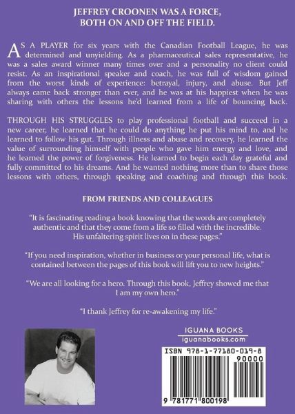 Jeffrey Croonen was a force, both on and off the field. As a player for six years with the Canadian Football League, he was determined and unyielding. As a pharmaceutical sales representative, he was a sales award winner many times over and a personality no client could resist. As an inspirational speaker and coach, he was full of wisdom gained from the worst kinds of experience: betrayal, injury, and abuse. But Jeff always came back stronger than ever, and he was at his happiest when he was sharing with others the lessons he'd learned from a life of bouncing back. Through his struggles to play professional football and succeed in a new career, he learned that he could do anything he put his mind to, and he learned to follow his gut. Through illness and abuse and recovery, he learned the value of surrounding himself with people who gave him energy and love, and he learned the power of forgiveness. He learned to begin each day grateful and fully committed to his dreams. And he wanted nothing more than to share those lessons with others, through speaking and coaching and through this book.