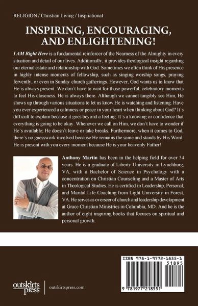 INSPIRING, ENCOURAGING, AND ENLIGHTENING! I AM Right Here is a fundamental reinforcer of the Nearness of the Almighty in every situation and detail of our lives. Additionally, it provides theological insight regarding our eternal estate and relationship with God. Sometimes we often think of His presence in highly intense moments of fellowship, such as singing worship songs, praying fervently, or even in Sunday church gatherings. However, God wants us to know that He is always present. We don't have to wait for those powerful, celebratory moments to feel His closeness. He is always there. Although we cannot tangibly see Him, He shows up through various situations to let us know He is watching and listening. Have you ever experienced a calmness or peace in your heart when thinking about God? It's difficult to explain because it goes beyond a feeling. It's a knowing or confidence that everything is going to be okay. Whenever we call on Him, we don't have to wonder if He's available; He doesn't leave or take breaks. Furthermore, when it comes to God, there's no guesswork involved because He remains the same and stands by His Word. He is present with you every moment because He is your heavenly Father!