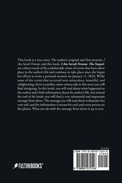This book is a true story. The author's original and first memoir, I Am Sarah Femme, and this book, I Am Sarah Femme: The Sequel, are a direct result of the unbelievable chain of events that have taken place in the author's life and continue to take place since she began her efforts to write a personal memoir on January 11, 2024. While some of the events that occurred were miraculous, beautiful, and enlightening, there is another, more serious side to this story you will find intriguing. In this book, you will read about what happened to the author and a little information about the author's life, but toward the end of the book, you will find a very substantial and important message from above. The message you will read about is dramatic but very real, and the information is meant for each and every person on the planet. What you do with the message from above is up to you.