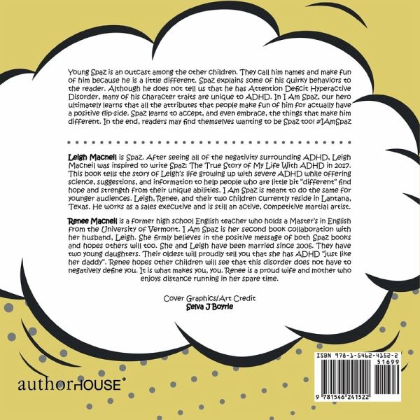 Young Spaz is an outcast among the other children. They call him names and make fun of him because he is a little different. Spaz explains some of his quirky behaviors to the reader. Although he does not tell us that he has Attention Deficit Hyperactive Disorder, many of his character traits are unique to ADHD. In I Am Spaz, our hero ultimately learns that all the attributes that people make fun of him for actually have a positive flip-side. Spaz learns to accept, and even embrace, the things that make him different. In the end, readers may find themselves wanting to be Spaz too! #IAmSpaz