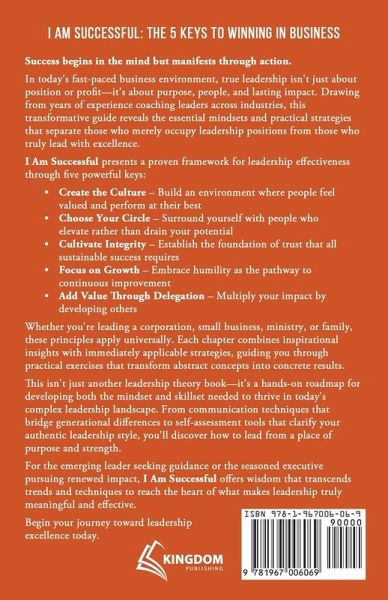 Success begins in the mind but manifests through action. In today's fast-paced business environment, true leadership isn't just about position or profit-it's about purpose, people, and lasting impact. Drawing from years of experience coaching leaders across industries, this transformative guide reveals the essential mindsets and practical strategies that separate those who merely occupy leadership positions from those who truly lead with excellence. I Am Successful presents a proven framework for leadership effectiveness through five powerful keys:Create the Culture - Build an environment where people feel valued and perform at their best Choose Your Circle - Surround yourself with people who elevate rather than drain your potential Cultivate Integrity - Establish the foundation of trust that all sustainable success requires Focus on Growth - Embrace humility as the pathway to continuous improvement Add Value Through Delegation - Multiply your impact by developing others Whether you're leading a corporation, small business, ministry, or family, these principles apply universally. Each chapter combines inspirational insights with immediately applicable strategies, guiding you through practical exercises that transform abstract concepts into concrete results. This isn't just another leadership theory book-it's a hands-on roadmap for developing both the mindset and skillset needed to thrive in today's complex leadership landscape. From communication techniques that bridge generational differences to self-assessment tools that clarify your authentic leadership style, you'll discover how to lead from a place of purpose and strength. For the emerging leader seeking guidance or the seasoned executive pursuing renewed impact, I Am Successful offers wisdom that transcends trends and techniques to reach the heart of what makes leadership truly meaningful and effective. Begin your journey toward leadership excellence today.