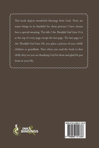 This book depicts wonderful blessings from God. There are many things to be thankful for, these pictures I have chosen have a special meaning. The title I Am Thankful God Gave Us is at the top of every page except the last page. The last page is I Am Thankful God Gave Me, you place a picture of your child/children or grandkids. Then when you read the book to that child, they see you are thanking God for them and glad He put them in your life.