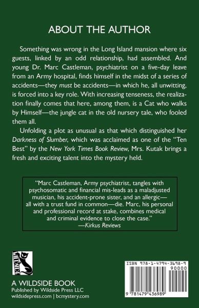 Something was wrong in the Long Island mansion where six guests, linked by an odd relationship, had assembled. And young Dr. Marc Castleman, psychiatrist on a five-day leave from an Army hospital, finds himself in the midst of a series of accidents — they must be accidents — a series of mad happenings in which he, all unwitting, is forced into a key role. With increasing tenseness, the realization finally comes that here, among them, is a Cat who walks by Himself — the jungle cat in the old nursery tale, who fooled them all. Unfolding a plot as unusual as that which distinguished her Darkness of Slumber, which was acclaimed as one of the "Ten Best" by the New York Times Book Review, Mrs. Kutak brings a fresh and exciting talent into the mystery held.