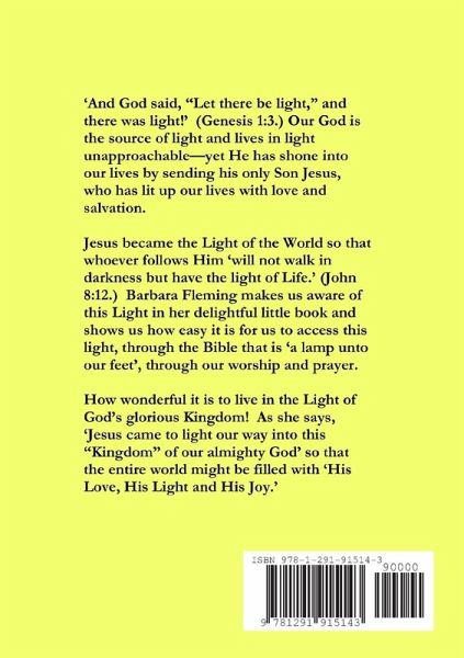 'And God said, "Let there be light," and there was light!' (Genesis 1:3.) Our God is the source of light and lives in light unapproachable-yet He has shone into our lives by sending his only Son Jesus, who has lit up our lives with love and salvation. Jesus became the Light of the World so that whoever follows Him 'will not walk in darkness but have the light of Life.' (John 8:12.) Barbara Fleming makes us aware of this Light in her delightful little book and shows us how easy it is for us to access this light, through the Bible that is 'a lamp unto our feet', through our worship and prayer. How wonderful it is to live in the Light of God's glorious Kingdom! As she says, 'Jesus came to light our way into this "Kingdom" of our almighty God' so that the entire world might be filled with 'His Love, His Light and His Joy.'