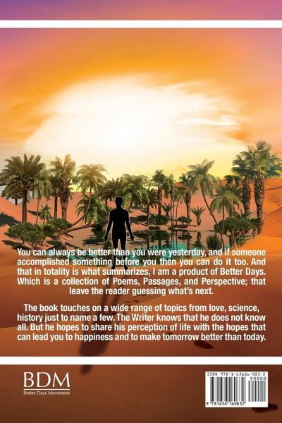 You can always be better than you were yesterday, and if someone accomplished something before you then you can do it too. And that in totality is what summarizes, I am a product of Better Days. Which is a collection of Poems, Passages, and Perspective; that leave the reader guessing what's next. The book touches on a wide range of topics from love, science, history just to name a few. The Writer knows that he does not know all. But he hopes to share his perception of life with the hopes that can lead you to happiness and to make tomorrow better than today.