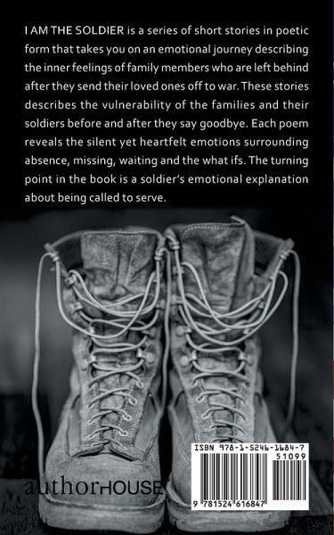 I AM THE SOLDIER is a series of short stories in poetic form that takes you on an emotional journey describing the inner feelings of family members who are left behind after they send their loved ones off to war. These stories describes the vulnerability of the families and their soldiers before and after they say goodbye. Each poem reveals the silent yet heartfelt emotions surrounding absence, missing, waiting and the what ifs. The turning point in the book is a soldier's emotional explanation about being called to serve.