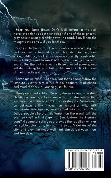 Keep your head down. Don’t look anyone in the eye. Never even think about technology if one of those ghostly, grey cars is sliding silently down the road. They’ll see the thoughts inside you, if you let them. Sam’s a technopath, able to control electronic signals and manipulate technology with his mind. And so, ever since childhood, his life has been a carefully constructed web of lies, meant to keep his Talent hidden, his powers a secret. But the Institute wants those unusual powers, and will do anything to get a hold of him and turn him into one of their mindless slaves. Sam slips up once. Just once, but that’s enough. Now the Institute is after him in full force. Soldiers, telekinetics, and mind readers, all gunning just for him. Newly qualified soldier, Serena, doesn’t even know she’s chasing a person, all she knows is that she has to find whatever the Institute is after before they do. But tracking an unknown entity through an unfamiliar city, with inaccurate intelligence, unexpected storms, and Gav Belias, people’s hero of the Watch, on the prowl, will she even survive? Will she get to Sam before the Institute does? His special skills could provide the rebellion with an incredible advantage, but not if they can’t get out of the city, and over the huge wall that stands between them and freedom.
