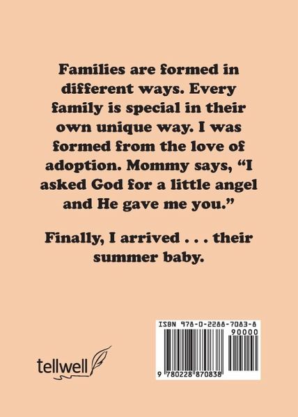 Families are formed in different ways. Every family is special in their own unique way. I was formed from the love of adoption. Mommy says, "I asked God for a little angel and He gave me you." Finally, I arrived . . . their summer baby.