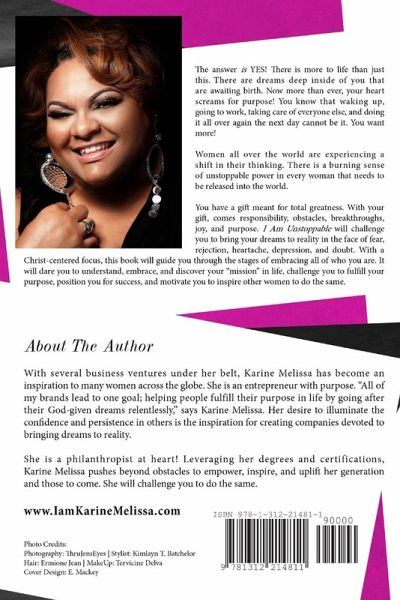 "I AM UNSTOPPABLE" 7 Stages of Embracing the Unstoppable You; For Women Passionately Chasing Their Dreams. The answer is YES! There is more to life than just this. There are dreams deep inside of you that are awaiting birth. Now more than ever, your heart screams for purpose! I Am Unstoppable will challenge you to bring your dreams to reality in the face of fear, rejection, heartache, depression, and doubt. With a Christ-centered focus, this book will guide you through the stages of embracing all of who you are. It will dare you to understand, embrace, and discover your "mission" in life, challenge you to fulfill your purpose, position you for success, and motivate you to inspire other women to do the same.