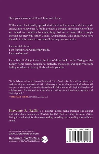 Shed your surnames of Doubt, Fear, and Shame. With a dose of spirituality sprinkled with a bit of humor and real-life experiences, author Shavonne R. Ruffin provides a thought-provoking view of how we should see ourselves by establishing that we are more than enough through our Heavenly Father. God is I AM; therefore, as his children, we have the right to this name, to proclaim all God says we are in him. I am a child of God. I am fearfully and wonderfully made. I am predestined. I Am Who God Says I Am is the first of three books in the Taking on the Family Name series, designed to motivate, encourage, and uplift you from feeling worthless to having God's value in your life.