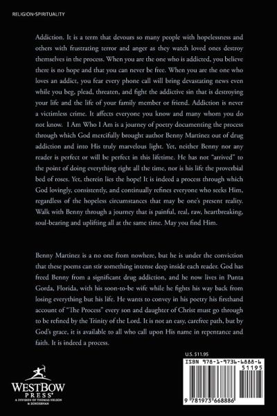 Addiction. It is a term that devours so many people with hopelessness and others with frustrating terror and anger as they watch loved ones destroy themselves in the process. When you are the one who is addicted, you believe there is no hope and that you can never be free. When you are the one who loves an addict, you fear every phone call will bring devastating news even while you beg, plead, threaten, and fight the addictive sin that is destroying your life and the life of your family member or friend. Addiction is never a victimless crime. It affects everyone you know and many whom you do not know. I Am Who I Am is a journey of poetry documenting the process through which God mercifully brought author Benny Martinez out of drug addiction and into His truly marvelous light. Yet, neither Benny nor any reader is perfect or will be perfect in this lifetime. He has not "arrived" to the point of doing everything right all the time, nor is his life the proverbial bed of roses. Yet, therein lies the hope! It is indeed a process through which God lovingly, consistently, and continually refines everyone who seeks Him, regardless of the hopeless circumstances that may be one's present reality. Walk with Benny through a journey that is painful, real, raw, heartbreaking, soul-bearing and uplifting all at the same time. May you find Him.