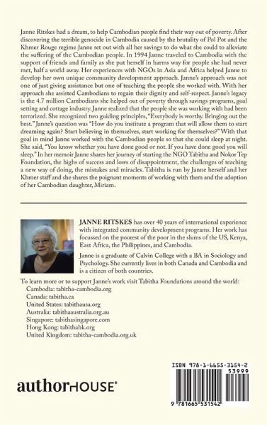 Janne Ritskes had a dream, to help Cambodian people find their way out of poverty. After discovering the terrible genocide in Cambodia caused by the brutality of Pol Pot and the Khmer Rouge regime Janne set out with all her savings to do what she could to alleviate the suffering of the Cambodian people. In 1994 Janne traveled to Cambodia with the support of friends and family as she put herself in harms way for people she had never met, half a world away. Her experiences with NGOs in Asia and Africa helped Janne to develop her own unique community development approach. Janne's approach was not one of just giving assistance but one of teaching the people she worked with. With her approach she assisted Cambodians to regain their dignity and self-respect. Janne's legacy is the 4.7 million Cambodians she helped out of poverty through savings programs, goal setting and cottage industry. Janne realized that the people she was working with had been terrorized. She recognized two guiding principles, "Everybody is worthy. Bringing out the best." Janne's question was "How do you institute a program that will allow them to start dreaming again? Start believing in themselves, start working for themselves?" With that goal in mind Janne worked with the Cambodian people so that she could sleep at night. She said, "You know whether you have done good or not. If you have done good you will sleep." In her memoir Janne shares her journey of starting the NGO Tabitha and Nokor Tep Foundation, the highs of success and lows of disappointment, the challenges of teaching a new way of doing, the mistakes and miracles. Tabitha is run by Janne herself and her Khmer staff and she shares the poignant moments of working with them and the adoption of her Cambodian daughter, Miriam.