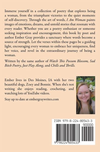 Immerse yourself in a collection of poetry that explores being a woman, from the triumphant victories to the quiet moments of self-discovery. Through the art of words, I Am Woman paints images of emotions, dreams, and untold stories that resonate with every reader. Whether you are a poetry enthusiast or someone seeking inspiration and encouragement, this book by poet and author Ember Gray provides a sanctuary where words become a source of strength. Let the verses within these pages be a guiding light, encouraging every woman to embrace her uniqueness, find her voice, and revel in the extraordinary journey of being a woman.