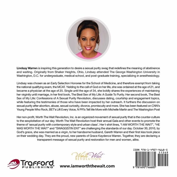 Lindsay Warren is inspiring this generation to desire a sexual purity swag that redefines the meaning of abstinence and waiting. Originally from Shaker Heights, Ohio, Lindsay attended The George Washington University in Washington, D.C. for undergraduate, medical school, and post-graduate training, specializing in anesthesiology. Lindsay was chosen as an Early Selection Honoree for the School of Medicine, and therefore exempt from taking the national qualifying exam, the MCAT. Yielding to the call of God on her life, she was ordained at the age of 21, and became a physician at the age of 25. Single until the age of 34, she boldly shares the experiences of maintaining her virginity until marriage, in her first book, The Best Sex of My Life: A Guide To Purity. Her second book, The Best Sex of My Life: Confessions of A Sexual Purity Revolution, discusses dating, courtship and engagement topics, while featuring the testimonies of those who have been impacted by her outreach. It furthers the discussion on sexual purity after abortion, abuse, sexual curiosity, divorce, promiscuity and more. She has been featured on CNN's Young People Who Rock, BET's Lift Every Voice, N PR's Tell Me More with Michelle Martin and The Washington Post Her non-profit, Worth The Wait Revolution, Inc. is an organized movement of sexual purity that is the counter-culture to the sexploitation of our day. Worth The Wait Revolution host their annual Gala and other events to promote the theme of 'sexual purity with contemporary style and urban class'. Her t-shirt lines, "I AM WORTH THE WAIT", "HE WAS WORTH THE WAIT" and "SWAGGSTIN ENT" are challenging the standards of our day. October 30, 2010, by God's grace, she was married as a virgin, to her handsome husband, Gareth Warren and their first kiss took place on their wedding day. They are the proud, new parents of Grace Kaydence Warren. Together, they are declaring a transparent message of sexual purity and restoration for men and women, alike.