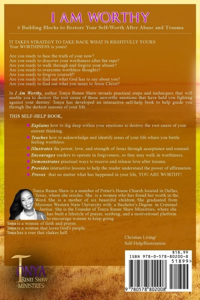 Title of book: I Am Worthy 8 Building Blocks to Restore Your Self-Worth After Abuse and Trauma By: Tonya Renee Shaw Feeling unworthy? Questioning the existence of Jesus Christ? Feeling like a failure? Questioning the purpose of your life? Are you WORTHY? Of course, you are but, IT TAKES STRATEGY TO TAKE BACK WHAT IS RIGHTFULLY YOURS Your WORTHINESS is yours! Are you ready to face the truth of your now? Are you ready to discover your worthiness after the rape? Are you ready to walk through and forgive your abuser? Are you ready to overcome worthless thoughts? Are you ready to forgive yourself? Are you ready to find out what God has to say about you? Are you ready to find out what you mean to Jesus Christ? In I Am Worthy, author Tonya Renee Shaw reveals practical steps and techniques that will enable you to destroy the root cause of those unworthy emotions that have held you fighting against your destiny. Tonya has developed an interactive self-help book to guide you through the darkest seasons of your life and restore your self-worth. This Self-Help Book, · Explains how to dig deep within your emotions to destroy the root cause of your current thinking patterns. · Teaches how to acknowledge and identify areas of your life where you feel worthless with the direction to overcome. · Illustrates the power, love, and strength of Jesus Christ through acceptance and counsel. · Encourages readers to operate in forgiveness, so they may walk in worthiness. · Demonstrates practical ways to receive and release love after abuse and trauma. · Provides interactive lessons to help the reader understand the power of affirmation. · Proves that no matter what happens in your life, YOU ARE WORTHY! Tonya Renee Shaw is a member of Potter's House Church located in Dallas, Texas, where she resides. She is a woman who has found her worth in the Word. She is a mother of six beautiful children. She graduated from Missouri Western State University with a Bachelor's Degree in Criminal Justice. She is the Founder of Tonya Renee Shaw Ministries, where she has built a lifestyle of prayer, scribing, and motivating women to keep going. Tonya is a woman of faith and prayer. Tonya is a woman that loves God's people. Tonya has a roar that shakes hell. Let's Take a Journey inside of YOU! Because YOU matter! I, promise you; you will survive this, whatever your "this" is. I, promise you; your life is not over. I, promise you; when you walk in worth, you will operate in power. I, promise you; your mistakes will no longer hinder you. I, promise you; what happened to you was not your fault. I, promise you; that you are the salt. I, promise you; that you will know to learn to know God as your Father.
