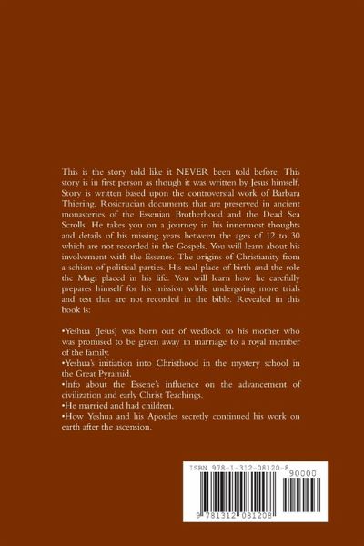 This is the story told like it NEVER been told before. This story is in first person as though it was written by Jesus himself. Story is written based upon the ideas of Barbara Theiring's, Rosicrucian documents that are preserved in the monasteries of the Essenian Brotherhood and the Dead Sea Scrolls. He takes you on a journey in his innermost thoughts and details of his missing years between the ages of 12 to 30 which are not recorded in the Gospels. You will learn about his involvement with the Essenes. His real place of birth and the role the Magi placed in his life. You will learn how the master politician carefully prepares himself for his mission while undergoing more trials and test that are not recorded in the bible.