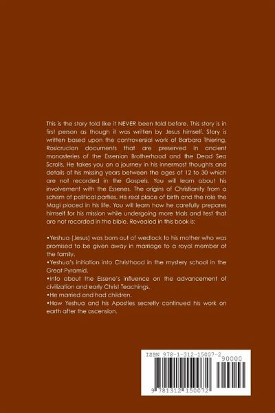 This is the story told like it NEVER been told before. This story is in first person as though it was written by Jesus himself. Story is written based upon the controversial work of Barbara Thiering, Rosicrucian documents that are preserved in ancient monasteries of the Essenian Brotherhood and the Dead Sea Scrolls. He takes you on a journey in his innermost thoughts and details of his missing years between the ages of 12 to 30 which are not recorded in the Gospels. You will learn about his involvement with the Essenes. The origins of Christianity from a schism of political parties. His real place of birth and the role the Magi placed in his life. You will learn how he carefully prepares himself for his mission while undergoing more trials and test that are not recorded in the bible.