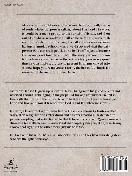 Many of my thoughts about Jesus come to me in small groups of souls whose purpose is talking about Him and His ways. It could be a men's group or dinner with friends, and then out of nowhere, a revelation will come to me and stick with me till I create it. In this case, I recall a discussion we were having in Sunday school, where we discovered that the only person who can truly proclaim to be "I am" is Jesus, because He is, was, and forever will be-the only person who can truly claim existence. From there, the idea grew in my quiet time into a simple sculpture to present His name carved into stone. I hope you're moved as I am by the beautiful, simplistic message of His name and who He is.