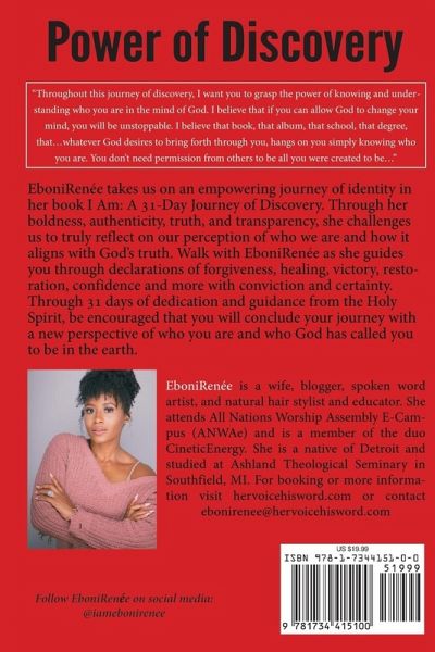 "Throughout this journey of discovery, I want you to grasp the power of knowing and understanding who you are in the mind of God. I believe that if you can allow God to change your mind, you will be unstoppable. I believe that book, that album, that school, that degree, that…whatever God desires to bring forth through you, hangs on you simply knowing who you are. You don't need permission from others to be all you were created to be…" EboniRenée takes us on an empowering journey of identity in her book I Am: A 31-Day Journey of Self-Discovery. Through her boldness, authenticity, truth, and transparency, she challenges us to truly reflect on our perception of who we are and how it aligns with God's truth. Walk with EboniRenée as she guides you through declarations of forgiveness, healing, victory, restoration, confidence and more with conviction and certainty. Through 31 days of dedication and guidance from the Holy Spirit, be encouraged that you will conclude your journey with a new perspective of who you are and who God has called you to be in the earth.