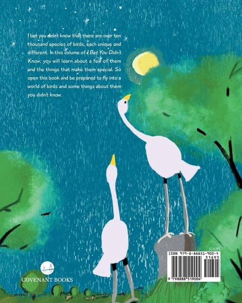 I bet you didn't know that there are over ten thousand species of birds, each unique and different. In this volume of I Bet You Didn't Know, you will learn about a few of them and the things that make them special. So open this book and be prepared to fly into a world of birds and some things about them you didn't know.