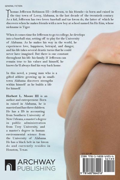 Thomas Jefferson Robinson IIIJefferson, to his friendsis born and raised in the tiny town of Leroy, Alabama, in the last decade of the twentieth century. As a kid, Jefferson has two loves: baseball and tae kwon do, the latter of which he discovers when he makes friends with a new boy at school named Jin Ho Kim, whose nickname is Tiger. When it comes time for Jefferson to go to college, he develops into a baseball star, setting off to play for the University of Alabama. As he makes his way in the world, he experiences love, happiness, betrayal, and danger, and his life takes several drastic turns that he could never have imagined. But there is one constant throughout his life: his family. If Jefferson can remain true to his values and himself, he knows hell always find his way back home. In this novel, a young man who is a gifted athlete growing up in small-town Alabama discovers strengths within himself as he builds a life for himself.