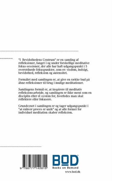 "I Bevidsthedens Centrum" er en samling af refleksioner, fanget i og under forskellige meditative fokus-sessioner, der alle har haft udgangspunkt i 5 overordnede fokuspunkter, som er: visdom, indsigt, bevidsthed, refleksion og autensitet. Formålet med samlingen er, at give en række bud på åbne refleksioner til brug i mulige meditationer. Bogens formål er, at inspirere til meditativ refleksionsarbejde, og bogens samling er ikke ment som en disciplin eller et system for, hvorledes man skal reflektere eller fokusere. Grundsynet i bogen er og tager udgangspunkt i "at enhver proces er unik" og at alle former for individuel meditation skaber refleksion.