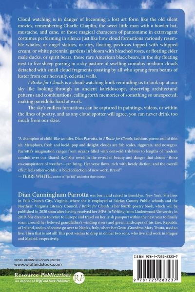 Cloud watching is in danger of becoming a lost art form like the old silent movies, remembering Charlie Chaplin, the sweet little man with a bowler hat, mustache, and cane, or those magical characters of pantomime in extravagant costumes performing in silence just like how cloud formations variously resemble whales, or angel statues, or airy, floating pavlovas topped with whipped cream, or white perennial gardens in bloom with bleached roses, or floating eider male ducks, or spirit bears, those rare American black bears, in the sky floating next to five sheep grazing in a sky pasture of swelling cumulus medium clouds detached with small cloud fragments coasting by all who sprang from beams of luster from our heavenly, celestial walls. I Brake for Clouds is a cloud-watching book reminding us to look up at our sky like looking through an ancient kaleidoscope, observing architectural patterns and combinations, calling forth memories of something so unexpected, making pareidolia hard at work. The sky's endless formations can be captured in paintings, videos, or within the lines of poetry, and as any cloud spotter will agree, you can never drink too much from our skies.